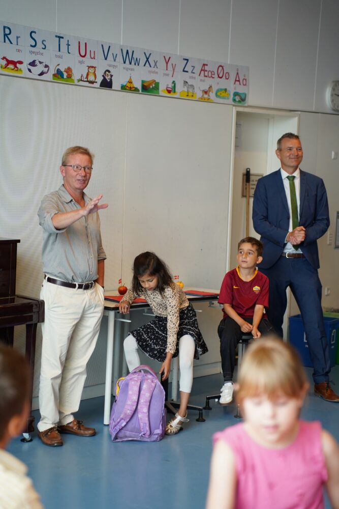 Første skoledag startede naturligvis med en sang, så både sanginspektøren og børne- og ungeborgmesteren fik varmet kroppene og stemmerne godt op, så de kunne synge med på “Jeg ved en lærkerede”.